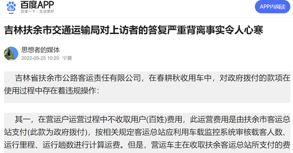 其一,在营运户运营过程中不收取用户(百姓)费用,此运营费用是由扶余市客运总站支付(此款为政府拨付),按相关规定客运总站应利用车载监控系统审核载客人数、运行里程、运行趟数进行计算运费。但是,营运车主在收取扶余客运总站所支付的费用中,客运总站并没有出示清晰的用车里程、用车趟数、载客人数。对于此情况,上访人已经反映到扶余市交通运输局,但该局在答复中并没有说明发放给运营车主的运营款项是否和车载记录相一致,并且没有对付费的依据给予明确的答复。
