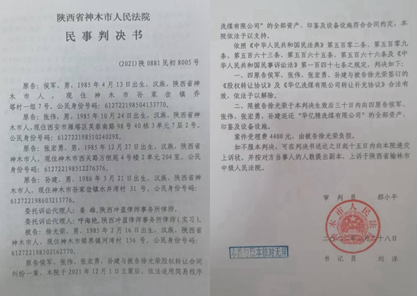 陕西省神木法院作出的(2021)陕0881民初8005号民事判决书,受理的侯军、张伟、张宏勇、孙建申请执行徐光荣合同纠纷一案,神木法院于2022年10月28日将华艺精洗煤有限公司查封,导致申请人徐光荣九年期间投资的1700多万设备、办公区、厂房被四被申请人蚕食吞并。
