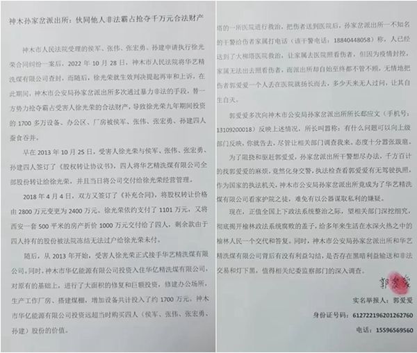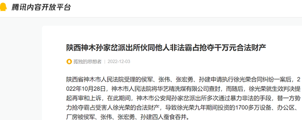 陕西省神木市人民法院受理的侯军、张伟、张宏勇、孙建申请执行徐光荣合同纠纷一案后,2022年10月28日,神木市人民法院将华艺精洗煤有限公司查封,而随后,徐光荣就生效判决提起再审和上诉,在此期间,神木市公安局孙家岔派出所多次通过暴力非法的手段,替一方势力抢夺霸占受害人徐光荣的合法财产,导致徐光荣九年期间投资的1700多万设备、办公区、厂房被侯军、张伟、张宏勇、孙建四人蚕食吞并。