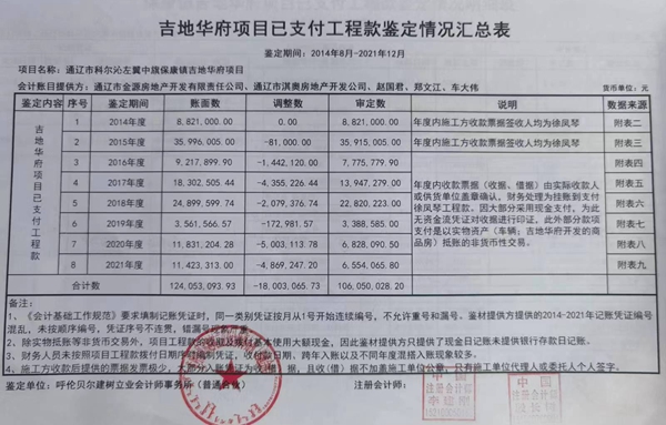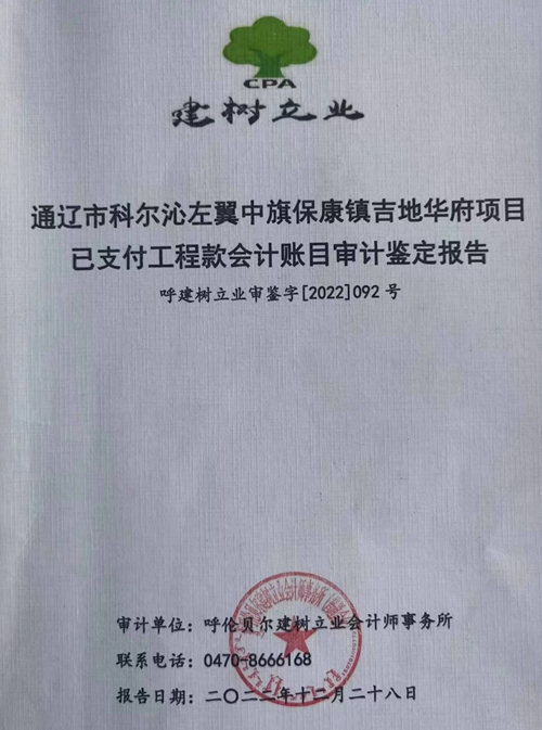 一、依规修改(变更)呼伦贝尔建树立业会计师事务所出具的《通辽市科尔沁左翼中旗保康镇吉林地华府项目已支付工程款会计账目审计鉴定报告》,即呼建树立业审鉴字【2022】092号;