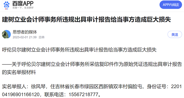 ——关于呼伦贝尔建树立业会计师事务所采信复印件作为原始凭证违规出具审计报告的实名举报材料