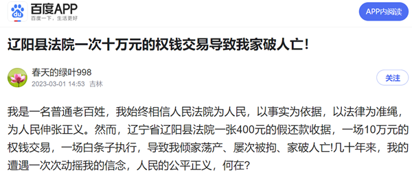 我是一名普通老百姓,我始终相信人民法院为人民,以事实为依据,以法律为准绳,为人民伸张正义。然而,辽宁省辽阳县法院一张400元的假还款收据,一场10万元的权钱交易,一场白条子执行,导致我倾家荡产、屡次被拘、家破人亡!几十年来,我的遭遇一次次动摇我的信念,人民的公平正义,何在?