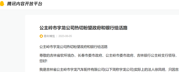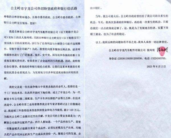 我是吉林省公主岭市宇龙汽车配件有限公司(以下简称宇龙公司)实际上的法人徐凤明,只因吉林银行公主岭支行(以下简称支行)领导换人导致政策转向,该行为了自身利益与小额贷公司联手违规操作,导致宇龙公司破产!为此,我曾经向很多媒体反映此事,诸多网络媒体也进行了广泛报道。现在,党中央、国务院和各级政府都十分重视发展民营经济,使我看到了企业起死回生的机遇,因此,我特致信各位领导,希望政府和银行能给点政策,让我们这家本来就很有希望的民营企业重现活力,为发展地方经济和促进就业做出应有的贡献。