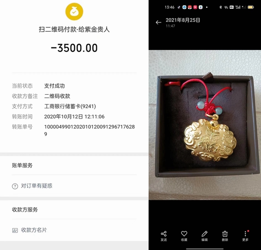 当时背景:2021年8月25日,我在鹤岗市六桂福珠宝店买了一个黄金长命锁,重量大概在15-20克之间,因为当时售货员说售后凭购买发票全国联保,我就把购买发票和金锁一起给李学平妻子了,为了方便以后维保。买回来后我就拍了一张长命锁的照片给李学平妻子发过去了,问她好看吗?她没有回复,看她没有回复我就给他打电话。她说在忙着带孩子,我就简单问候一下,顺便说了一下孩子满月送孩子一个长命锁,讨个吉祥的好彩头,她也表示感谢,后我说过几天去看孩子。2021年9月20日,我买了六套0-6个月的婴儿装,还有一个黄金长命锁一起交给了李学平的妻子。