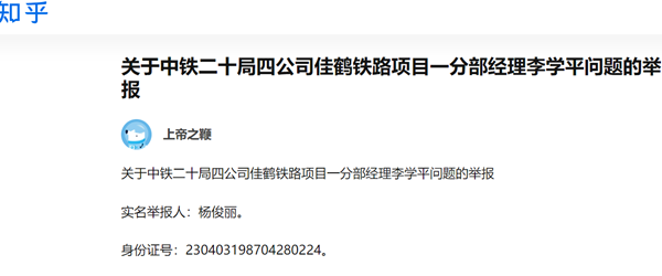 关于中铁二十局四公司佳鹤铁路项目一分部经理李学平问题的举报
