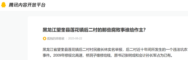 黑龙江省望奎县莲花镇后二村村民徼长林实名举报,后二村近十年间所发生的一个违法坑农事件。2009年修绥北高速,桥洞子维修给钱,原书记张树成和会计孙长军占为已有。