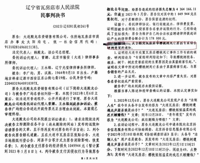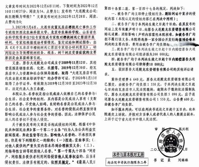 4、高兴利无视有证明力的证据却采信涉嫌假证、伪证的一张废纸判案,肆意践踏法律。高兴利作为独审法官,对文中引用的大量盖有权威机构公章和专家签字的证据(如上文所述的《分析报告》、《技术鉴定意见书》和《信访事项处理意见书》等)连理都不理,却采信没有任何机构盖章、没有任何专家签字承认的一张废纸——《关于瓦房店市樱桃树死亡原因专家综合研判意见》,该意见称:研判结论为导致樱桃树枝条、根系、树干树皮受害症状的主要原因是由真菌病害引起。”高并据此判决李广军构成名誉侵权。而这份《研判意见》早已在网上被骂的狗血喷头,是一个没有任何机构盖章承认,也没有任何专家签字认账的废纸,被广大农户和律师们认为是假证、伪证,是大连市农业农村局为了袒护大连殿龙出具的遮羞布!即使这个所谓的《研判意见》能够作为定案的证据使用,也不能作为控告人转发稿子构成名誉侵权的证据,因为控告人转发的稿子发表于2022年12月6日前后,而这个所谓的《研判意见》出笼于2023年5月22日,根据法律规定和新闻的时效性,不能以后来出现的证据否定以前所发表新闻的真实性。