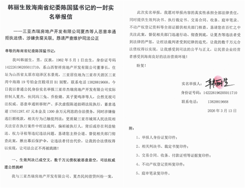 海南三亚数千万元债权遭悬空?韩丽生实名举报夏杰等人恶意逃债