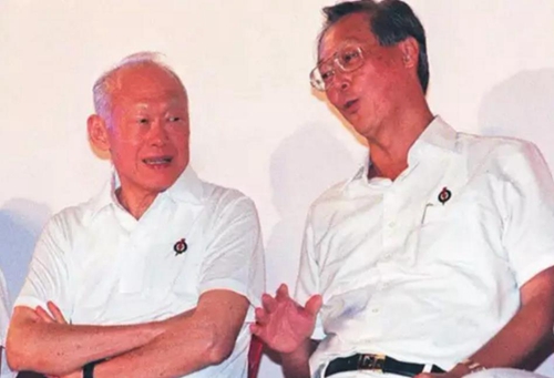 1996年12月22日,人民行动党的一次选举集会上,时任新加坡总理的吴作栋与李光耀交谈。吴作栋是继李光耀之后新加坡第二任总理。