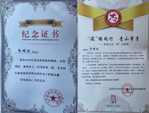 在高铁站旁的“爱豪国际酒店”,齐明佳终于找到了援鄂医疗队。他们都捂着大口罩,不分男女,头发精短。医疗队身上那又脏又皱的标志性服装,在齐明佳看来,却是那样亲切。经过了长途跋涉,终于见到亲人了。幸福而激动的泪水,又一次涌出了她的眼眶。