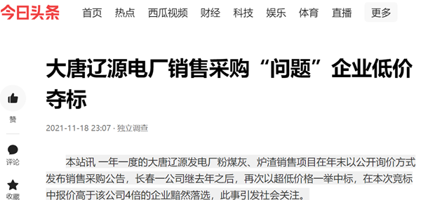 2021年11月12日,大唐辽源发电厂粉煤灰、炉渣销售结果对外公布,作为“老客户”的同力公司以总价60万元的超低价格再次一举夺标,每吨低至1.5元。而每吨报价5.6元,总价为224万元的美奥公司却被惨遭淘汰。
