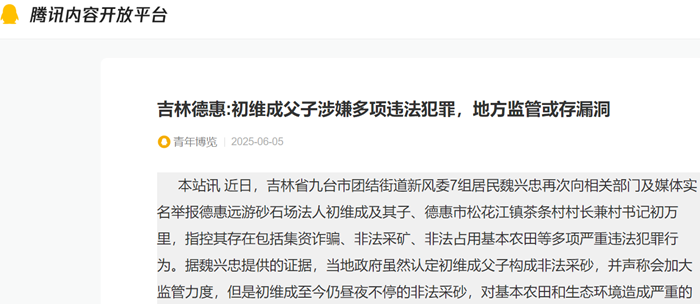 本站讯 近日,吉林省九台市团结街道新风委7组居民魏兴忠再次向相关部门及媒体实名举报德惠远游砂石场法人初维成及其子、德惠市松花江镇茶条村村长兼村书记初万里,指控其存在包括集资诈骗、非法采矿、非法占用基本农田等多项严重违法犯罪行为。据魏兴忠提供的证据,当地政府虽然认定初维成父子构成非法采砂,并声称会加大监管力度,但是初维成至今仍昼夜不停的非法采砂,对基本农田和生态环境造成严重的破坏。