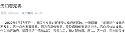 2020年1月27日下午,武汉市长周兴旺接受央视记者采访,一推两搡:“前面这个披露的不及时,这一点大家要理解。因为它是传染病,传染病有传染病防治法,它必须依法披露。作为地方政府,我获得这个信息以后,授权以后,我才能披露。所以,这一点,在当时很多不理解。”“后来,特别是元月20日,G务院召开常务会议,确定了这个病作为乙类传染病,并进行甲类传染病的管理,而且要求属地负责。从这之后,我们认为我们的工作就主动多了。而且,在很多方面的一些强硬的措施上,不是慢半拍,那是可以说是硬了一拍。”