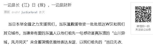 当日本举全國之力支援我们,当东瀛救援物资一批批抵达W汉和我们其它城市,当谦卑有爱的东瀛人以他们祖先一句感动鉴真东渡的“山川异域,风月同天”来含蓄深情优雅地表达友谊、以我们祖先的“岂曰无衣、与子同裳”既抒发一衣带水有难同当的情谊又向我们的文化致敬,长日发表评论文章,酸不溜丢说什么“奥斯维辛之后,写诗是残忍的”。