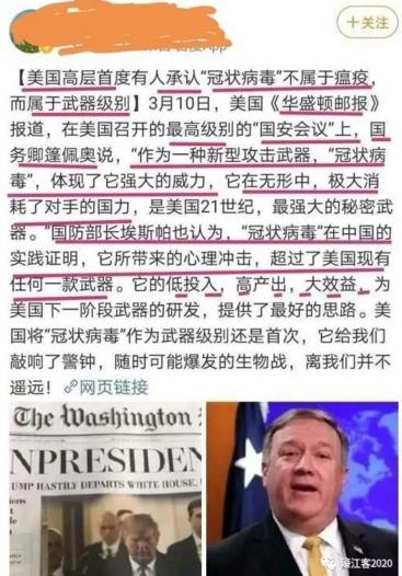 据胡总的微博及贴图,一名国内的大学教授,自称据美国《华盛顿邮报》的消息,美国高层官员承认:当前全世界流行的新型冠状病毒,不是瘟疫,而是病毒武器。