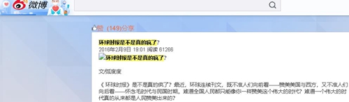 《 环球时报》是不是真的疯了?最近,环球连续刊文,既不准人们向前看——赞美美国与西方,又不准人们向后看——怀念毛时代与民国时期。难道全国人民都只能像你一样赞美这个伟大的时代?难道一个伟大的时代真的从来都是人民赞美出来的?