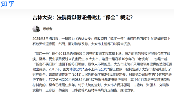 2025年3月初以来,一篇题为《吉林大安:棚改项目滨江一号缘何民怨四起?》的新闻在网上石破天惊逗春雨。然而,面对...