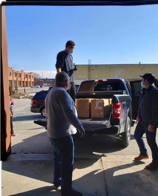 然后立即自己开车到了捐赠者的仓库门口。在两名工人帮助下将手术医用口罩装到他的卡车后面。