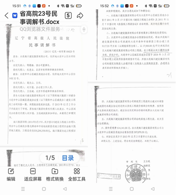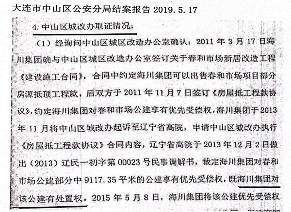 借老百姓的钱用完了,工程也快封顶了,此时已到了2013年年底,邹德海知道城改办自己是有钱的,但多次去要,城改办就说没有,而且,到这时土地使用证也没有办,此时,从民间借来的钱大都早已到期,可他还不上了。邹德海急了,在几次商量未果的情况下,他想到了法院,于是,他去了辽宁省高级人民法院,将中山区城改办告上了法庭。省高院很快就下达了00023号民事调解书,确定:海川集团享有案涉工程优先受偿权;案涉工程公建1-3层部分9117.35平方米抵顶海川集团建设工程款;城改办限期于2014年3月15日前,缴纳土地出让金,为海川办理《销售许可证》。从此,这身为甲方的城改办与乙方海川集团,由开始的合作关系变成了敌对关系,也从此,邹德海噩梦开始了,也开始一步步走向了监狱。