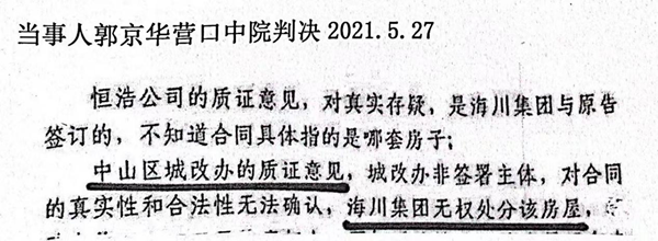 城改办否定了自己当初与邹德海签订的协议,否定辽宁省高院的判决,其实是为了帮助邹德海逃避对老百姓的债务;城改办对所有老百姓查封涉案公建都有异议,唯独对恒浩公司的查封没有异议,目的是要把公建给恒浩(涉嫌重大利益输送),并且老百姓的查封还都是先于恒浩公司查封的,诡异的是城改办这样说,法院就这样判决了。事实呢?法律呢? 难道这些法官的“枉法裁判”已成日常工作?据法律工作者说,城改办已经构成“虚假诉讼罪”了。更为荒唐的是,大连市中院邹德海案刑庭认定那9000余平方米的案涉公建房屋是海川集团邹德海的,而民庭老百姓案却认定那9000余平方米的案涉公建房屋是城改办的,致使众多老百姓全体败诉。