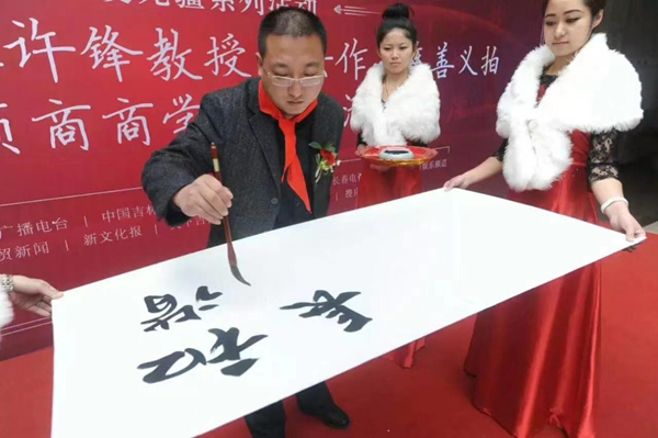 图为:书法家许锋“悬纸书法”作品为公益事业筹集善款。